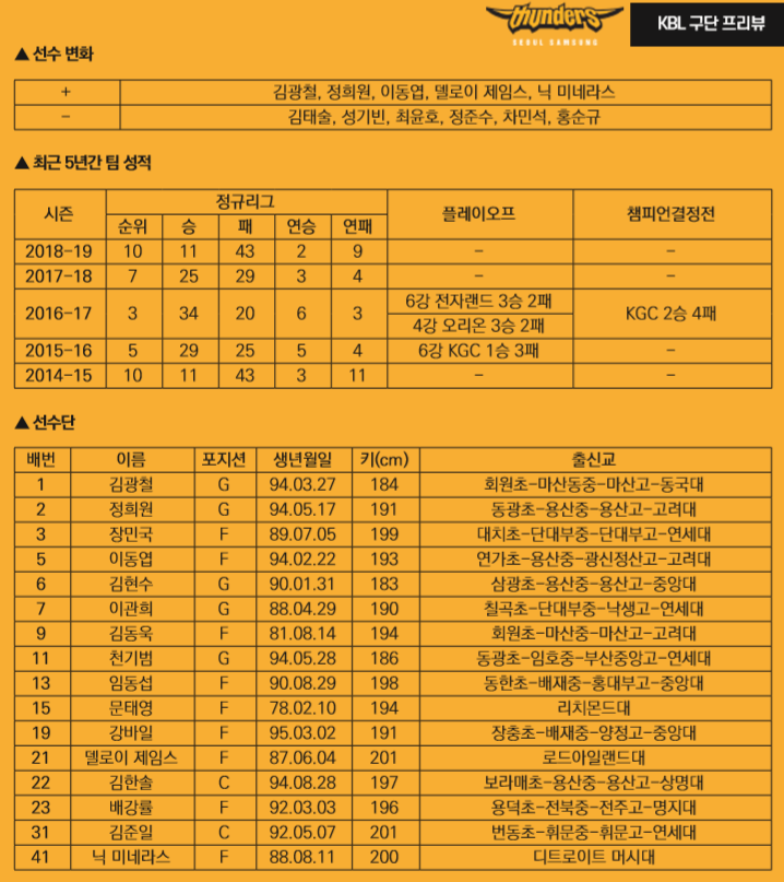 삼성은 올 시즌을 함께 할 외국선수로 닉 미네라스(200cm, 32)와 델로이 제임스(198cm, 33)를 낙점했다. 두 선수 모두 신장은 2m에 가깝지만 플레이 스타일은 정통 빅맨이 아닌 외곽 타입의 선수다.