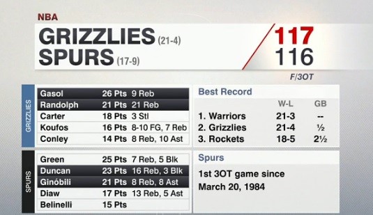 이번 시즌 최고의 경기 중 하나. 막판 마이크 콘리와 대니 그린이 한 차례씩 클러치 3점슛을 주고 받았다. 스퍼스의 3점차 리드. 그런데 마크 가솔이 지노빌리를 속인 뒤 말도 안 되는 동점 3점슛을 터뜨리며 연장전에 돌입했다.