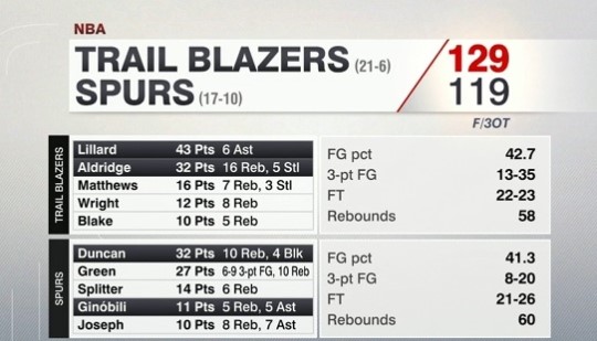포틀랜드 트레일 블레이저스 129 @ 119 샌안토니오 스퍼스 (3차 연장)