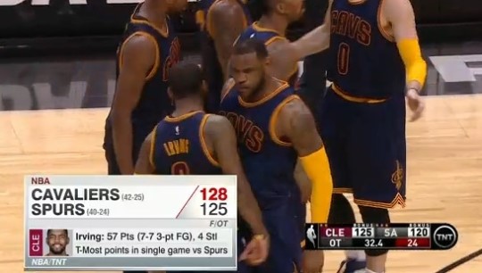 캐벌리어스의 마지막 공격. 어빙은 믿을 수 없는 동점 3점슛을 꽂아 넣었다. 패색 짙던 경기를 연장전으로 끌고 간 것이었다. 어빙의 활약은 연장전에서도 계속 됐다. 연장에서만 10점을 올리며 총 57점을 쏟아낸 것.