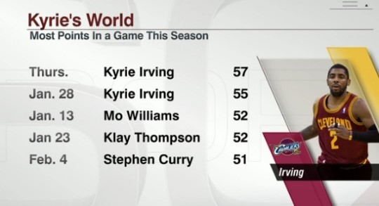 어빙이 기록한 57점은 이번 시즌 개인 한 경기 최다득점 기록이다. 종전 기록 역시 본인이 포틀랜드 트레일 블레이저스와의 경기에서 세운 55점이었다. 당시 어빙은 19개의 3점슛을 시도해 무려 11방을 작렬시키며 팀 승리를 주도했다.