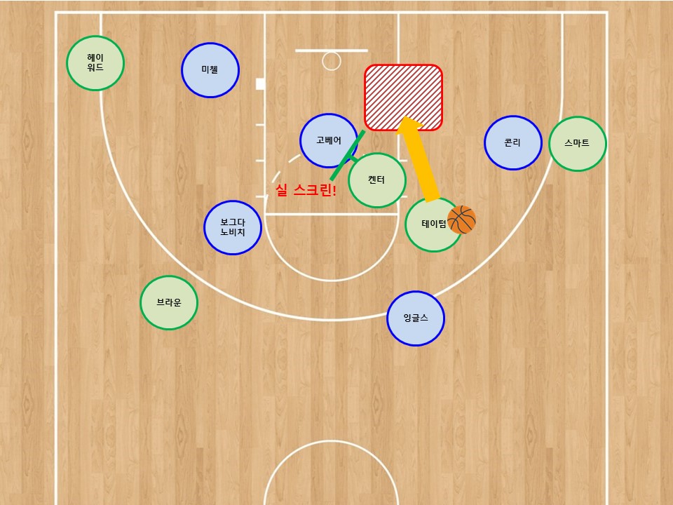 드랍백 수비를 통해 골밑에서 기다리고 있던 고베어는 켄터의 ‘실 스크린’에 가로막혀 테이텀의 돌파에 이은 슛 시도를 제대로 견제할 수 없었다. 테이텀은 켄터가 만든 ‘벽’ 뒤에서 높은 각도의 레이업슛을 통해 결국 돌파 득점을 올렸다.
