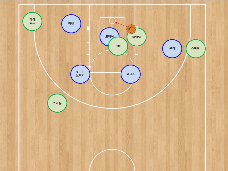 여기서 주목할 것이 에네스 켄터의 움직임이다. 켄터는 테이텀이 돌파하는 타이밍에 맞춰 자신의 마크맨이이며 드랍백 수비를 펼치고 있던 루디 고베어를 몸으로 밀어내며 테이텀을 위한 돌파 공간을 만들어준다.