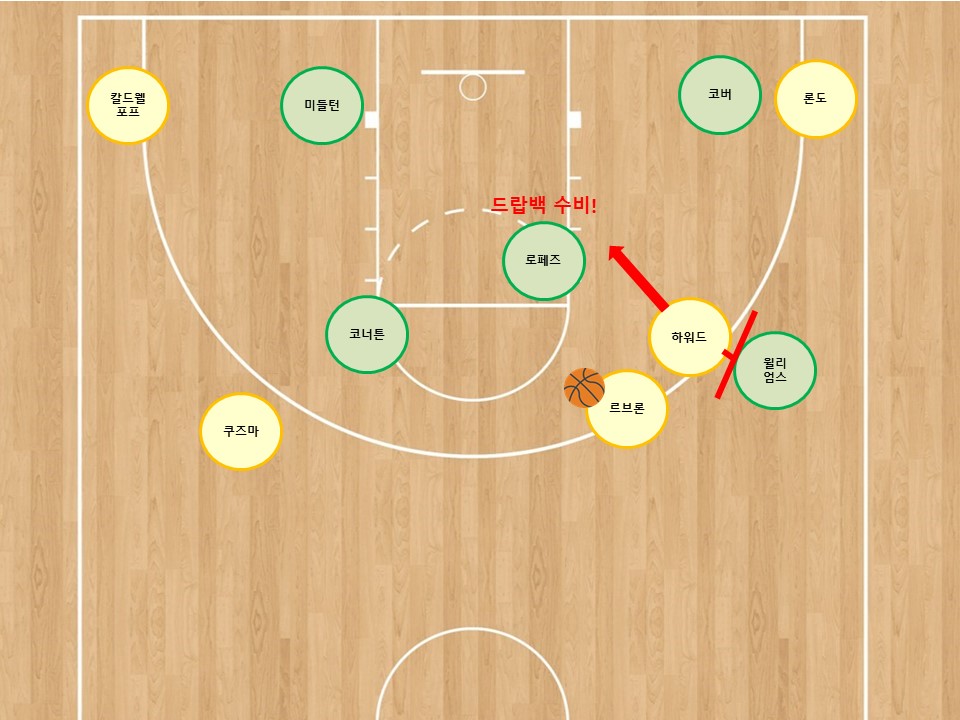 르브론 제임스를 중심으로 한 2대2 공격이 중요한 팀인 만큼, 이날 레이커스의 성패는 드랍백 수비 공략에 달려 있다고 해도 과언이 아니었다.