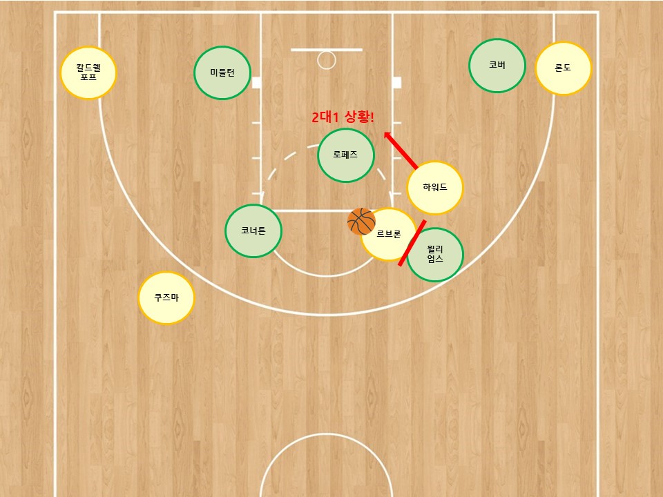 이때 순간적으로 브룩 로페즈는 1대2의 상황에 놓인다. ①자신의 앞에서 드리블을 하며 돌파를 노리는 르브론 제임스와 ②스크린을 건 후 페인트존으로 달려가는 드와이트 하워드를 모두 견제해야 하는 것이다.