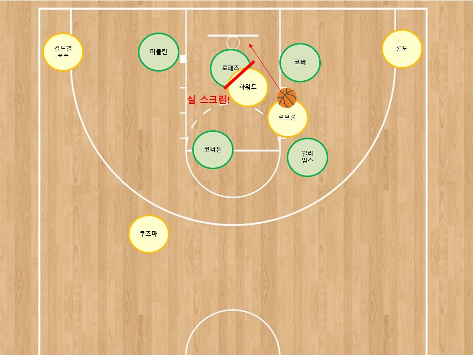 이 경기에서 레이커스는 실 스크린을 활용해 총 3차례, 승부처였던 4쿼터에만 2차례나 르브론 제임스의 득점을 만들어냈다.