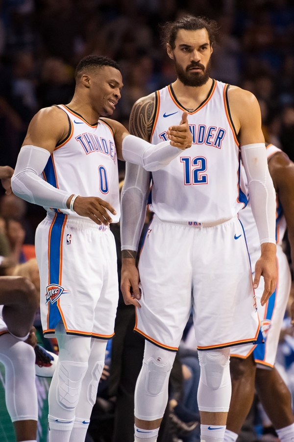 (▲러셀 웨스트브룩과 함께 뛰던 시절 스티븐 아담스는 절묘한 실 스크린을 통해 그의 돌파 득점을 돕곤 했다.)