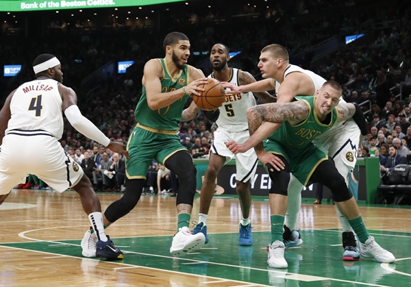 (▲위 사진 속 다니엘 타이스의 모습을 주목하자. 등과 엉덩이로 니콜라 요키치의 몸을 막아서고 있다. 이를 활용해 제이슨 테이텀은 골밑으로 돌파해 슛을 시도하려 한다. 여기서 타이스가 만드는 벽이 바로 실 스크린이다. 실 스크린은 오펜스 파울의 위험이 높은 스크린이기에 상당한 노련미를 필요로 한다.)
