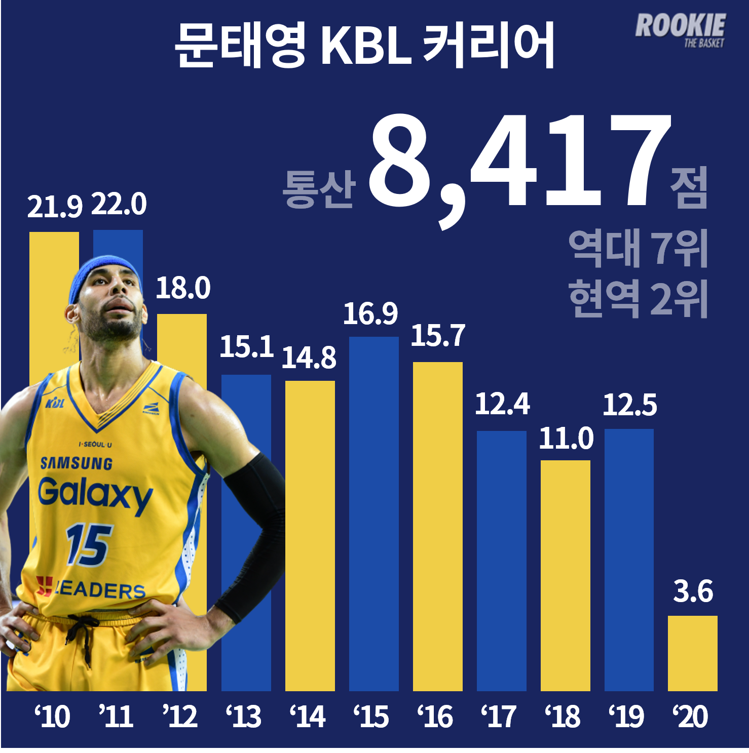 지난 09-10시즌 KBL에 이륙한 문태영은 통산 11시즌을 뛰면서 8,417점을 기록한 KBL의 역사다. 문태영의 8,417점은 리그 역대 7위에 해당하는 득점 기록이며 현역 선수 중에서는 애런 헤인즈(10,780점)에 이어 2위다.