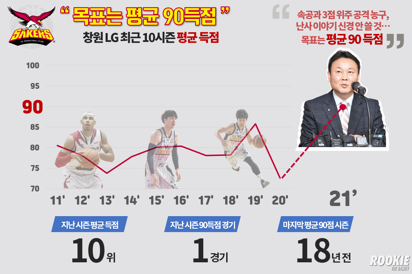 조 감독은 공식 기자회견에서 "수비 농구는 한계가 있다. 상대가 100점을 넣으면, 그보다 더 넣어서 승리할 것"이라고 차원이 다른 공격농구를 예고했다. 그가 목표로 하는 LG의 올 시즌 평균 득점은 90점. LG가 최근 평균 90점을 기록한 시즌은 지금으로부터 18년 전인 조 감독이 현역으로 뛰던 01-02시즌이다.