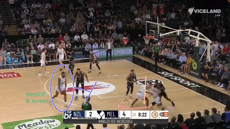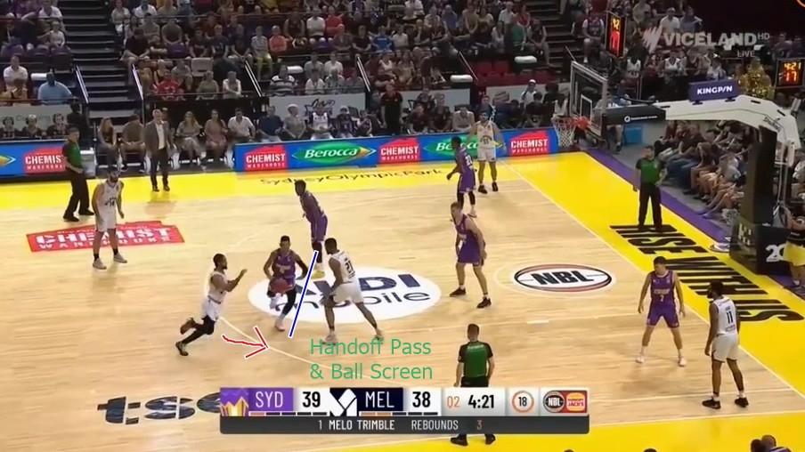 볼을 몰던 가드가 3점슛 라인 안으로 진입하는 숀 롱에게 갑자기 패스를 한다. 숀 롱은 그 자리에서 정지. 그리고 곧바로 다시 가드에게 볼을 건네는 핸드오프 패스를 시도한다.