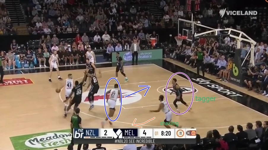 여기서 흥미로운 것은 1번의 움직임이다. 1번은 자신의 마크맨이 롱에게 태깅을 가기 어렵도록 만들기 위해, 롱이 림으로 달려드는 것과 동시에 코너에서 45도로 이동한다. 이 같은 1번의 움직임을 전술적으로 쉐이킹(shaking)이라고 칭한다.
