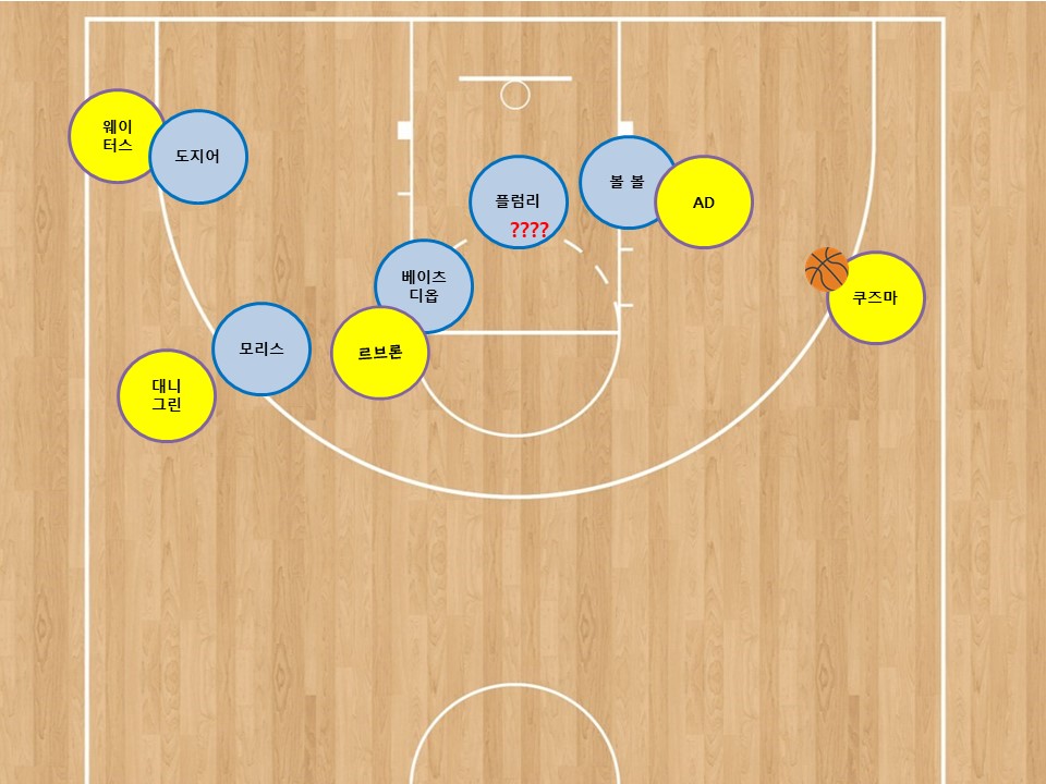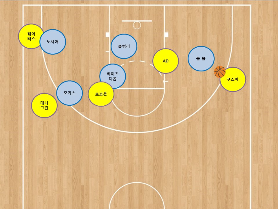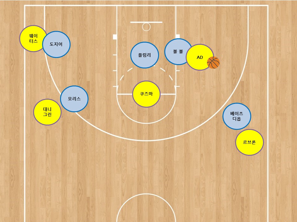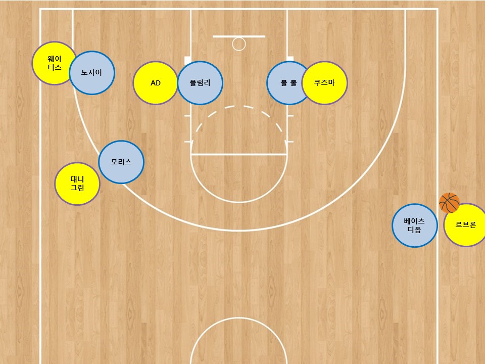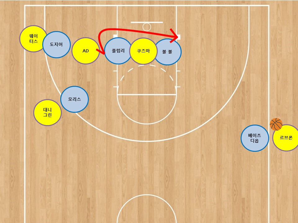 다이어그램을 통해 계속 확인해보자. 포스트의 데이비스가 볼을 받은 상태. 인바운드 패스를 한 르브론은 코트 안으로 들어왔다.