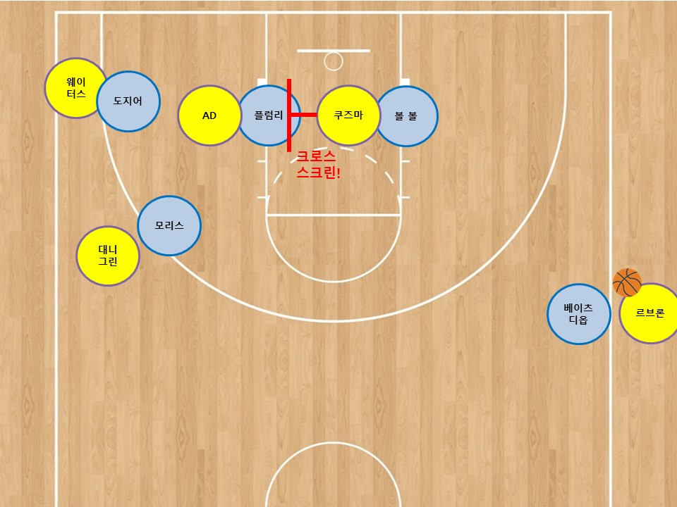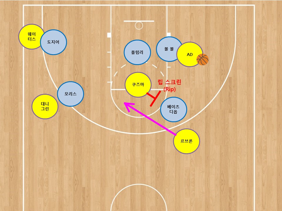 이번 패턴에서 르브론은 앤써니 데이비스에게 인바운드 패스를 하고, 그 이후엔 쿠즈마의 립 스크린을 받아 반대편 사이드로 컷인하는 역할을 맡았다.