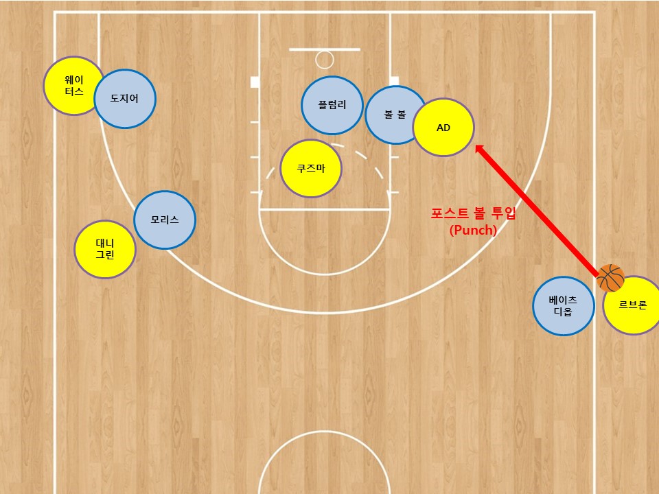 데이비스가 오른쪽 사이드 포스트에 자리잡자 르브론이 인바운드 패스를 건넨다. 데이비스가 포스트에서 안전하게 볼을 잡았다. 펀치(Punch)가 실행된 것이다.