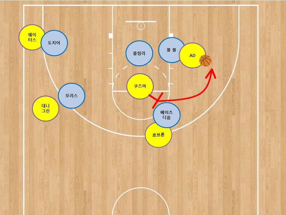 이를 위해 오른쪽 사이드 로우 포스트에 서 있던 카일 쿠즈마는 5초 바이얼레이션을 카운트하는 심판의 휘슬이 불리자마자 데이비스 쪽으로 달려가 그를 위해 스크린을 건다. 로우 포스트 지역에서 사이드라인 방향을 바라보며 걸어주는 크로스 스크린이다.