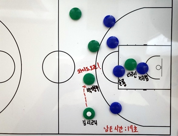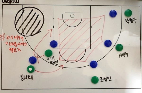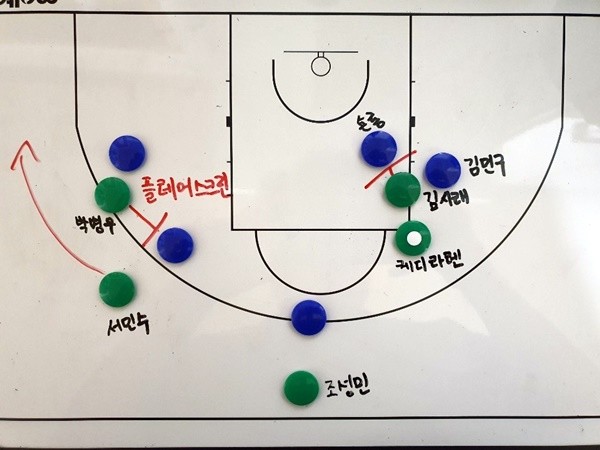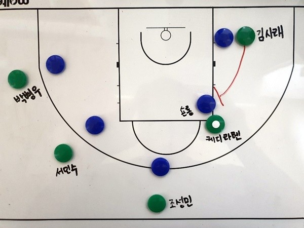 라렌이 엘보우에서 볼을 받은 가운데 탑에 조성민, 반대편 45도와 코너에 각각 서민수와 박병우가 자리해 있다. 그리고 스트롱사이드(볼이 있는 사이드)의 숏 코너에는 김시래가 자리하고 있다.