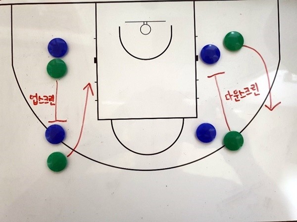 왼쪽 상황처럼 공격수가 하프라인 쪽을 바라보며 거는 스크린을 업 스크린(up screen)이라고 한다. 반대로 오른쪽 상황처럼 공격수가 림 쪽을 바라보며 거는 스크린은 다운 스크린(down screen)이다. 하프라인이 위쪽에, 림이 아래 쪽에 있는 것이라고 생각하면 이해가 쉽다.