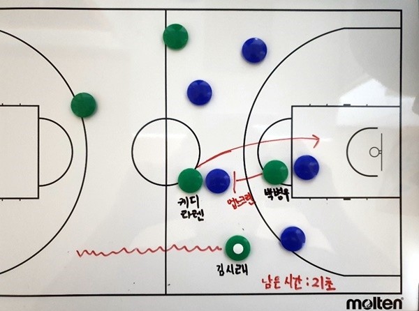 - 9분 41초: 케디 라렌-김시래 엘보우 픽앤롤(오른쪽 사이드, 남은 시간 16초)