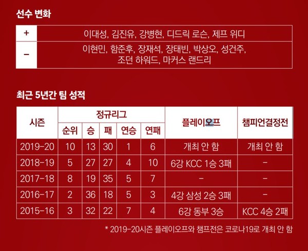 강을준 감독 : 선수단 변화가 큰 만큼 손발을 맞추는 시간이 많이 필요했다. 예상했던 것보다 20% 정도는 아쉬운 부분이 있다. 아무래도 코로나19라는 문제가 있었고 또 해외 전지훈련을 가지 못했기 때문에 완벽하다고 볼 수는 없었던 비시즌이었다.