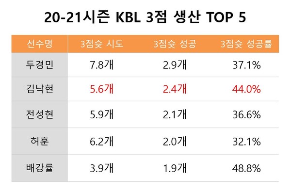 특히 3점슛 부문에서 생산력과 효율이 엄청나다. 경기당 5.6개를 던져 2.4개를 성공하고 있다. 성공 개수는 두경민(2.9개)에 이어 리그 전체 2위다. 3점슛 성공률이 무려 44.0%에 달한다.