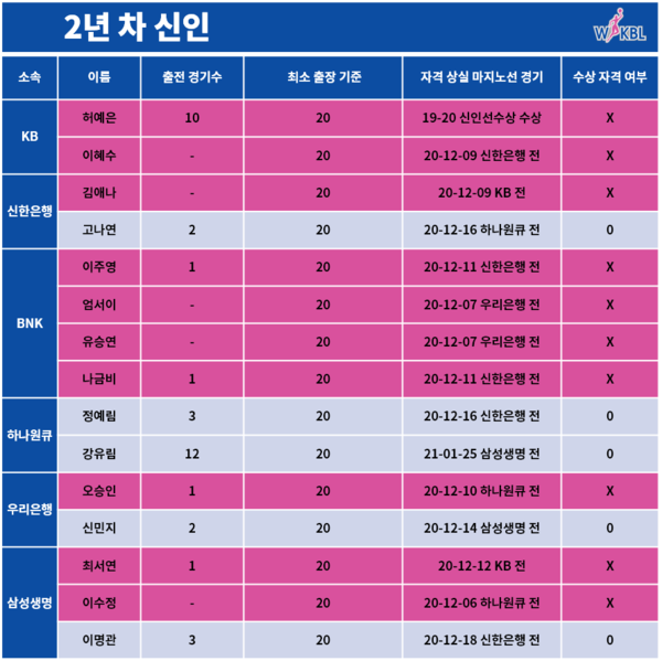 표에 따르면, 2년 차 신인 15명 중 지난 시즌 신인상을 받은 허예은을 포함, 이미 10명의 선수가 신인상 자격이 없다. 2년 차 신인 중 가장 유력한 신인상 후보는 독보적으로 12경기에 나온 부천 하나원큐 포워드 강유림으로 올 시즌 12경기 평균 12분 58초를 뛰면서 3.8점 1.4리바운드 3점슛 성공률 33.3%의 쏠쏠한 활약을 펼치고 있다.