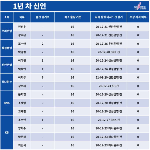 올 시즌 팀당 경기 수는 30경기다. 따라서 지난 11월 초 열린 신입선수 선발회에서 입단한 1년 차 신인의 신인상 최소 출장 기준은 16경기이며, 2년 차 선수의 최소 출장 기준은 20경기다. 다음은 신인 선수들의 출장 현황.