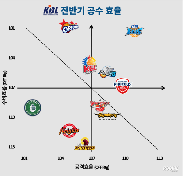전반기, 가장 좋은 오펜시브 레이팅을 기록한 팀은 전주 KCC였다. KCC는 리그 유일하게 110이 넘는 공격효율을 자랑했는데, 인상적인 것은 디펜시브 레이팅 또한 101.4로 리그 전체 2위였다는 것. 그래프 속에서도 KCC는 마치 독도처럼 멀찌감치 떨어져 있다. 그만큼 올 시즌 KCC의 정규리그는 공수에서 ‘어나더레벨’을 자랑하고 있다.