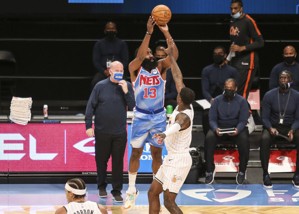 이 경기에서는 어빙이 빠진 채 하든과 듀란트만 나섰다. 그리고 이들은 무려 74점을 합작하며 올랜도의 수비를 박살냈다. 하든은 브루클린 데뷔전에서 32점 14어시스트 12리바운드로 트리플-더블을 기록. 새로운 팀의 유니폼을 입은 데뷔전에서 최초로 30득점이 동반된 트리플-더블을 달성한 선수로 이름을 남겼다.