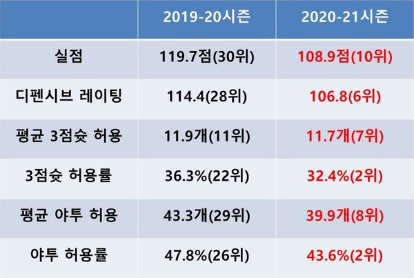 이 뿐만이 아니다. 이번 시즌 애틀랜타의 디펜시브 레이팅 수치는 106.8. 리그에서 6번째로 뛰어난 기록이다. 상대의 야투를 억제하는 능력 또한 뛰어나다. 현재까지 애틀랜타는 경기 당 야투 허용(39.9개, 8위), 야투 허용률(43.6%, 2위), 3점슛 허용(11.7개, 7위), 3점슛 허용률(32.4%, 2위)에서 모두 리그 상위권에 이름을 올리고 있다.
