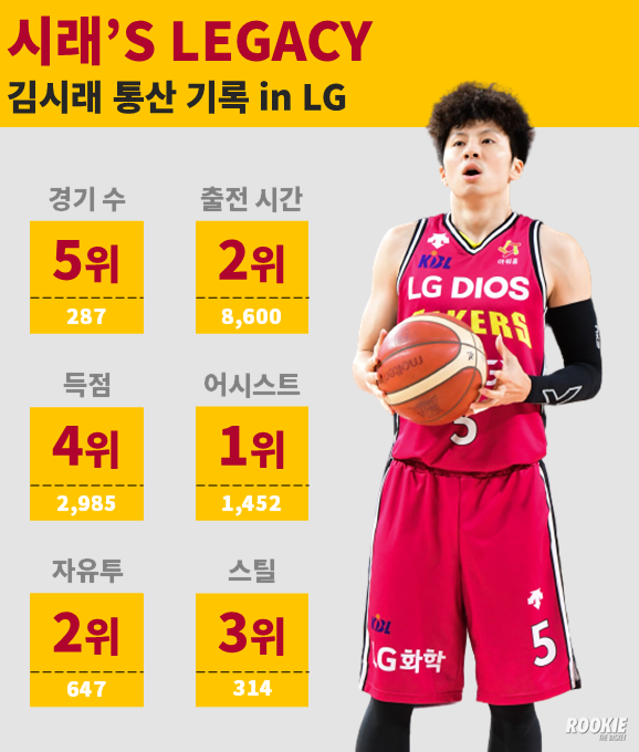 프로의 시작은 2012년 울산 현대모비스였지만, 2년 차에 LG로 트레이드돼 활약한 김시래는 LG의 명실상부한 프랜차이즈 스타다. LG 유니폼을 입고 287경기를 8,600분 56초 동안 뛰면서 통산 2,985득점에 1,452어시스트 314스틸을 기록했다.