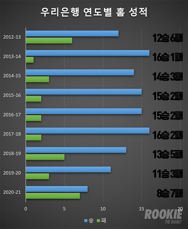 김정은, 박혜진, 최은실 등 주축 선수들이 부상으로 온전히 시즌을 다 소화하지 못한 이번 시즌도 우리은행은 21승 8패를 기록하며 승률 72.4%를 유지하고 있다. 그런데, 올 시즌 유독 안방에서는 약한 모습을 보였다.