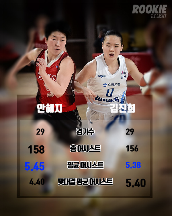 각각 29경기씩을 마친 가운데, 두 선수의 어시스트 수는 158(5.45)-156(5.38)으로 안혜지가 2개 더 많다.