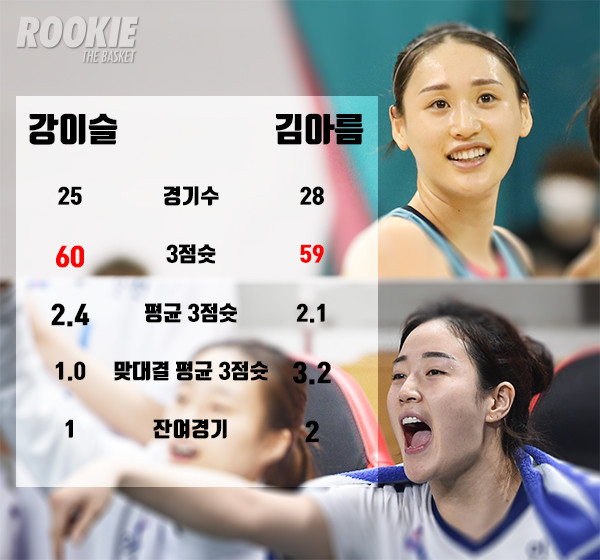 김아름은 최근 3경기에서 평균 8개의 3점슛을 시도하며. 시즌 평균(6.1개)보다 더 많이 3점슛을 노리고 있다. 성공률도 33.3%로 나쁘지 않다. 반면 강이슬은 지난 두 경기에서 단 8개의 3점슛을 던져 자신의 시즌 평균(6.4개)보다 적은 시도를 보였다.