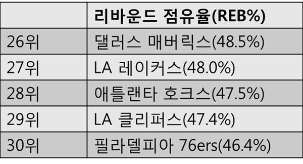 리바운드 점유율(REB%) 기록을 보면 더욱 확실히 알 수 있다. 클리퍼스는 지난 시즌 47.4%(리그 29위)의 리바운드 점유율을 보였다. 필라델피아 76ers(46.4%)를 제외하면 가장 낮은 수치. REB%가 50% 이하인 리그 17팀 중 50승 이상을 기록한 팀은 클리퍼스가 유일했다. 그만큼 제공권 싸움에서 항상 밀리는 모습이었다.