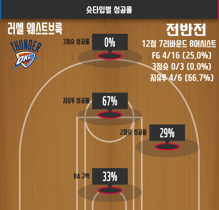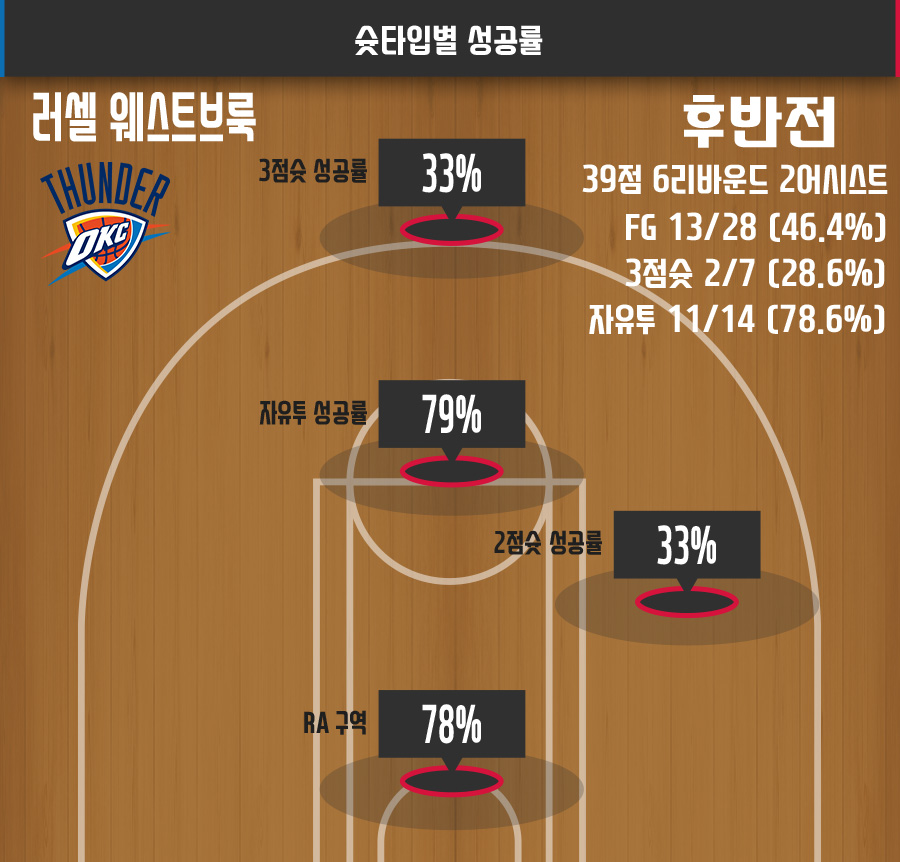야투성공률 등 효율성은 낮았다. 하지만 승부처 활약은 나무랄 데 없었다. 전반전에 매우 부진했던 웨스트브룩은 후반(연장 포함)에 뛰었던 총 26분 동안 무려 39점을 쓸어담는 경이로운 활약을 보여줬다.