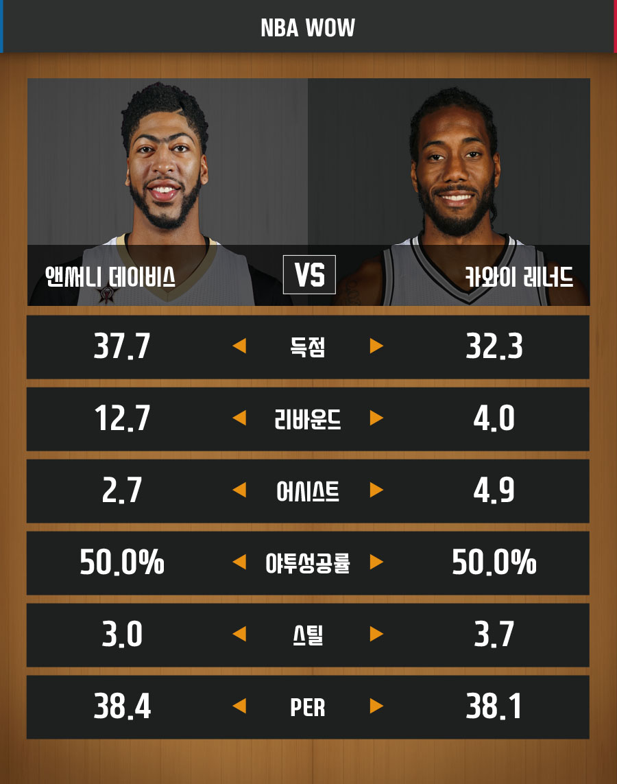 그중 가장 눈에 띄는 선수는 뉴올리언스 펠리컨스의 앤써니 데이비스와 샌안토니오 스퍼스의 카와이 레너드다. 이들은 각자의 플레이를 뽐내며 현재 리그 PER(Player Efficiency Rating) 순위 1위와 2위를 각각 차지하고 있다.