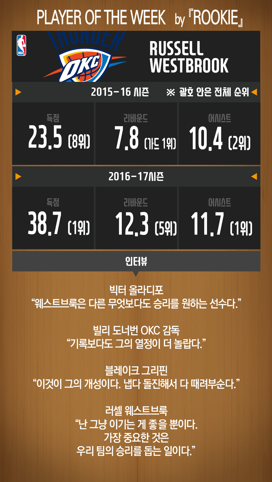 - [루키] 2016-17 선수랭킹 5위 러셀 웨스트브룩