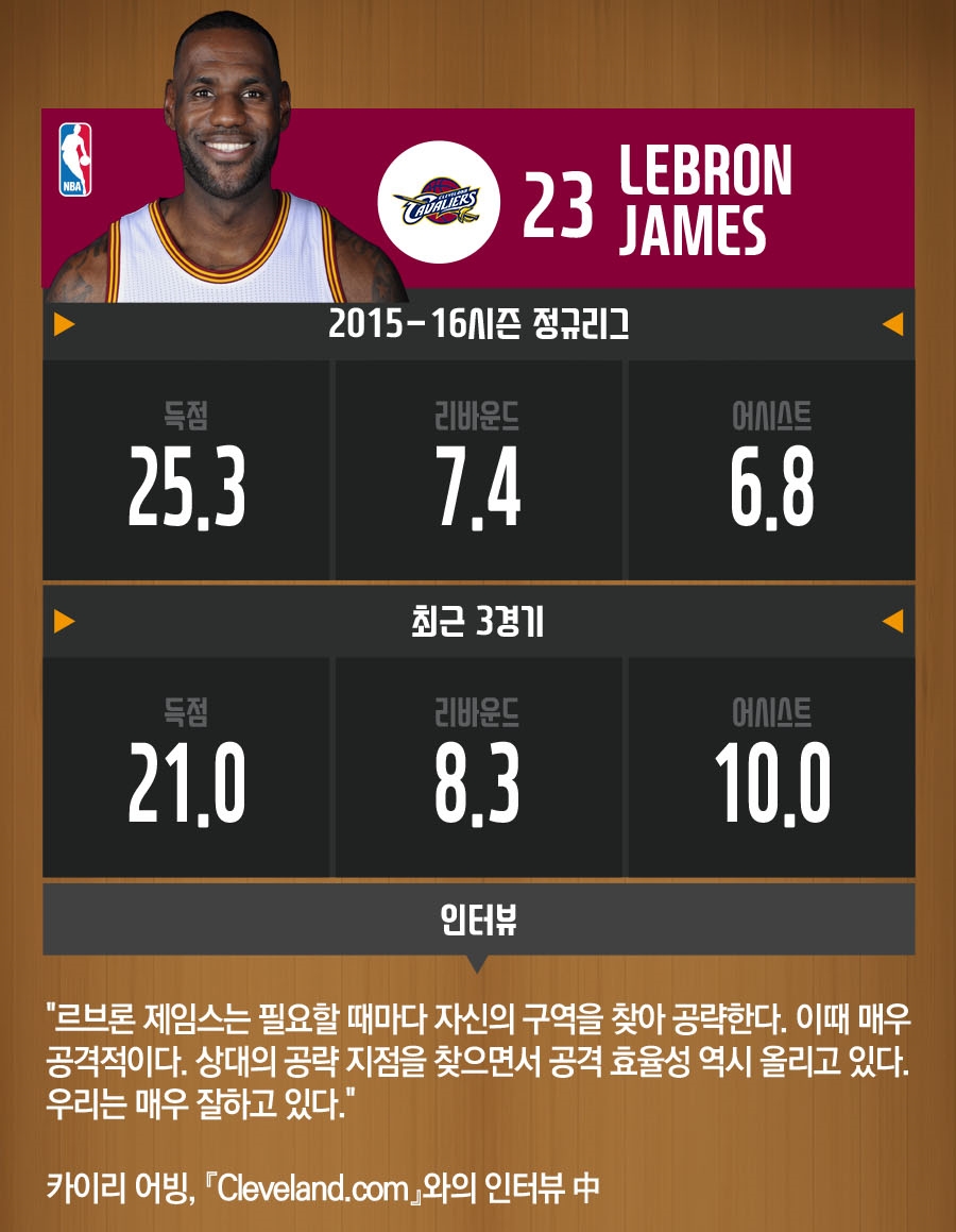 르브론은 개막 첫 3경기에서 득점보다 패싱 게임 위주의 플레이를 펼치고 있다. 카이리 어빙의 평균 득점(25.0점)이 더 높을 정도로 야투 시도가 적은 편이다. 그러나 공격이 풀리지 않을 때는 어김없이 해결사로 나서고 있다. 돌파와 중거리슛 등 어느 곳에서든 득점을 올리며 클리블랜드의 에이스다운 면모를 뽐내고 있다.