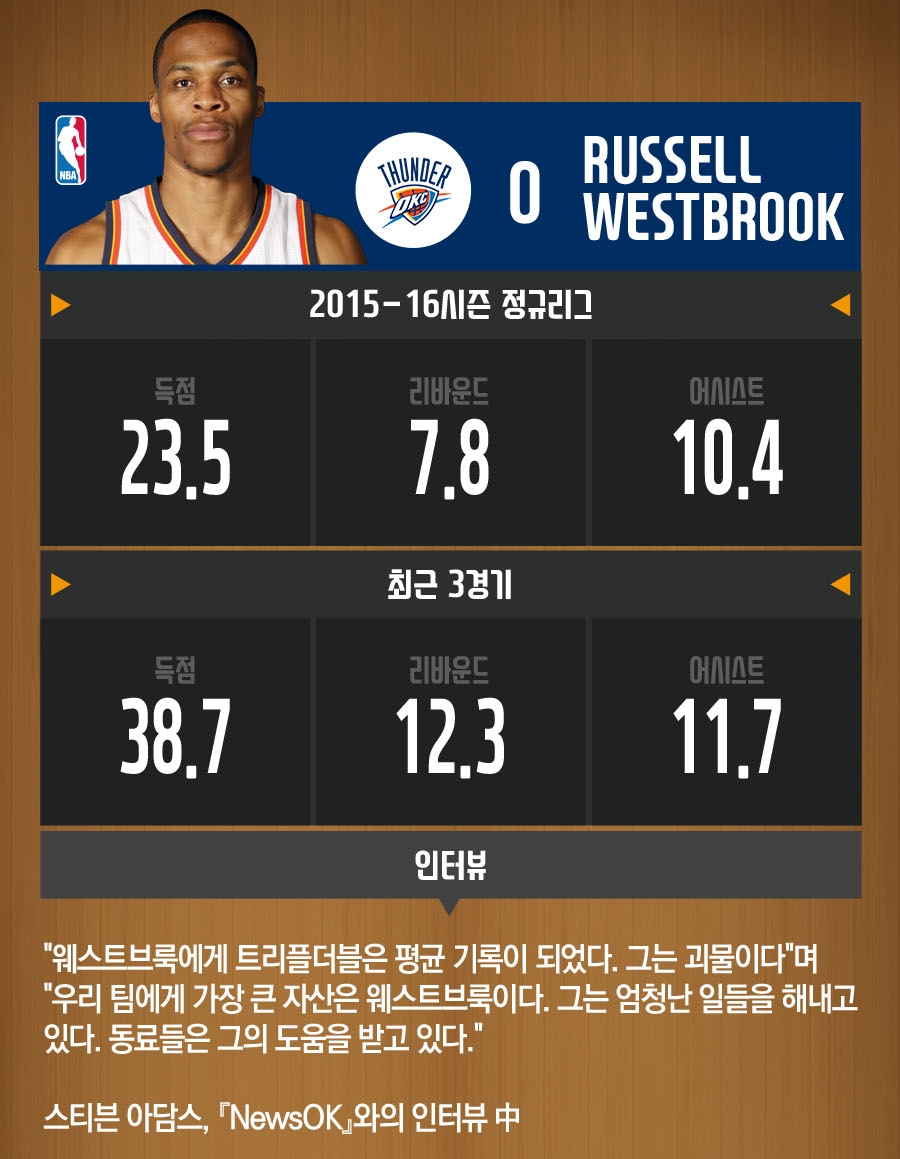 웨스트브룩의 기세는 정말 놀랍다. 개막 첫 3경기 중 2번의 트리플더블을 달성했다. 1982-83시즌의 매직 존슨에 이어 34년 만의 이 기록의 주인공이 되었다. 그뿐만 아니라 첫 3경기에서 100+점 30+리바운드 30+어시스트를 올린 역대 최초의 선수가 되었다. NBA 역사를 새로 쓰고 있다.