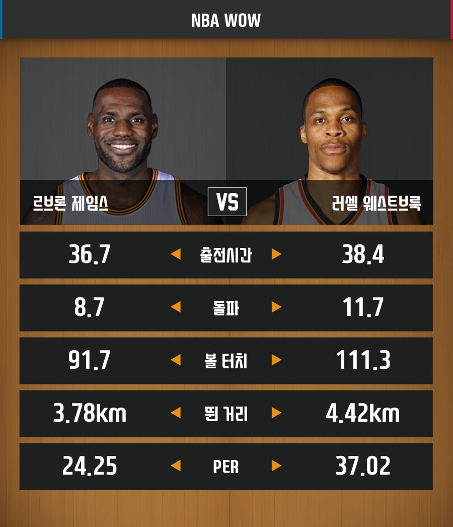 뛴 거리도 길었다. 경기당 평균 4.42km를 뛰어다니며 리그 3위에 올랐다. 반면, 르브론은 3.78km로 리그 40위를 기록했다. PER(분당생산력)은 웨스트브룩이 월등히 높았다. 출전시간 대비 각종 수치가 모두 리그 상위권을 차지한 결과라고 볼 수 있다. 웨스트브룩의 PER은 리그 3위였다(르브론의 PER 순위는 리그 32위).