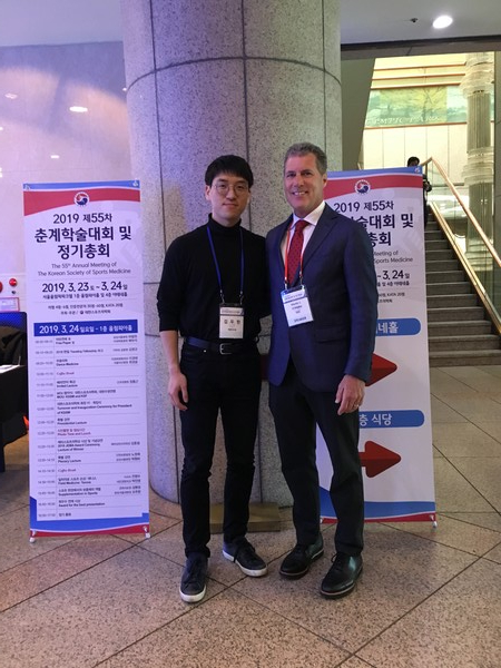 ▲ 계명대학교 동산병원 김두한 교수. 맨 아래 사진은 2019년 대한스포츠학회 당시의 닥터 오말레이(오른쪽)와 김두한 교수.