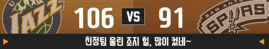 유타 재즈가 샌안토니오 원정에서 대어를 낚았다. 그간 스페이싱이 안 돼 갑갑한 공격을 펼쳤지만 이날은 달랐다. 무려 15개의 3점슛(48.4%)을 적중시키며 스퍼스의 견고한 외곽수비를 허물어버렸다. 또, '스퍼스 출신' 조지 힐이 22점 7어시스트를 올리며 샌안토니오의 백코트진을 유린했다.