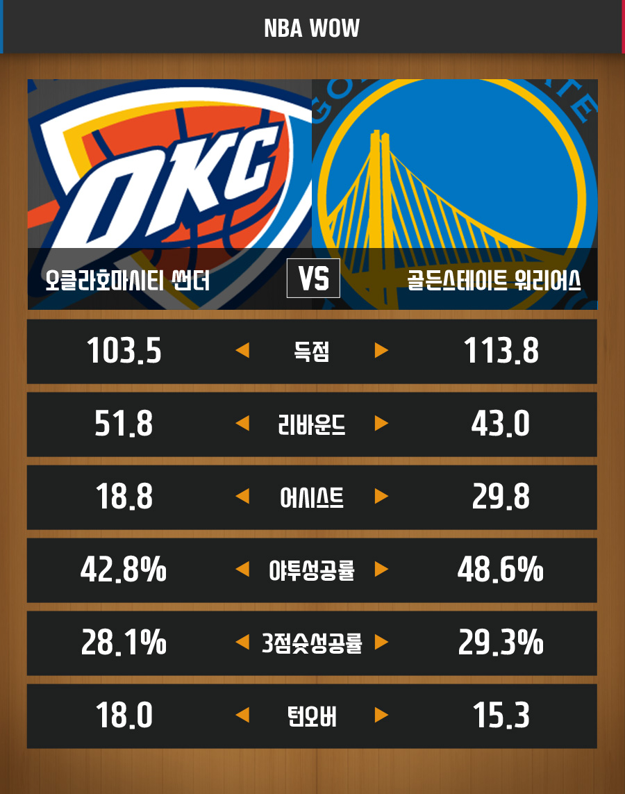 오클라호마시티는 주전과 벤치의 격차가 심한 팀이다. 따라서 골든스테이트가 벤치 자원들을 잘 활용한다면, 그리 어렵지 않게 승리할 수도 있다.