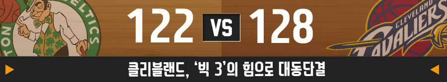 클리블랜드 캐벌리어스의 '빅 3'가 모두 터진 경기. 알 호포드(뇌진탕)가 결장한 상황에서도 끝까지 잘 싸워준 보스턴 셀틱스가 대견할 따름. 르브론 제임스(30점 7리바운드 12어시스트)는 역시 페이스 조절의 황제다. 필요할 때가 되면 본인이 전면에 서서 팀을 이끈다. 카이리 어빙은 이미 누구보다 믿음직한 공격 자원. 케빈 러브의 꾸준한 활약도 고무적이다.