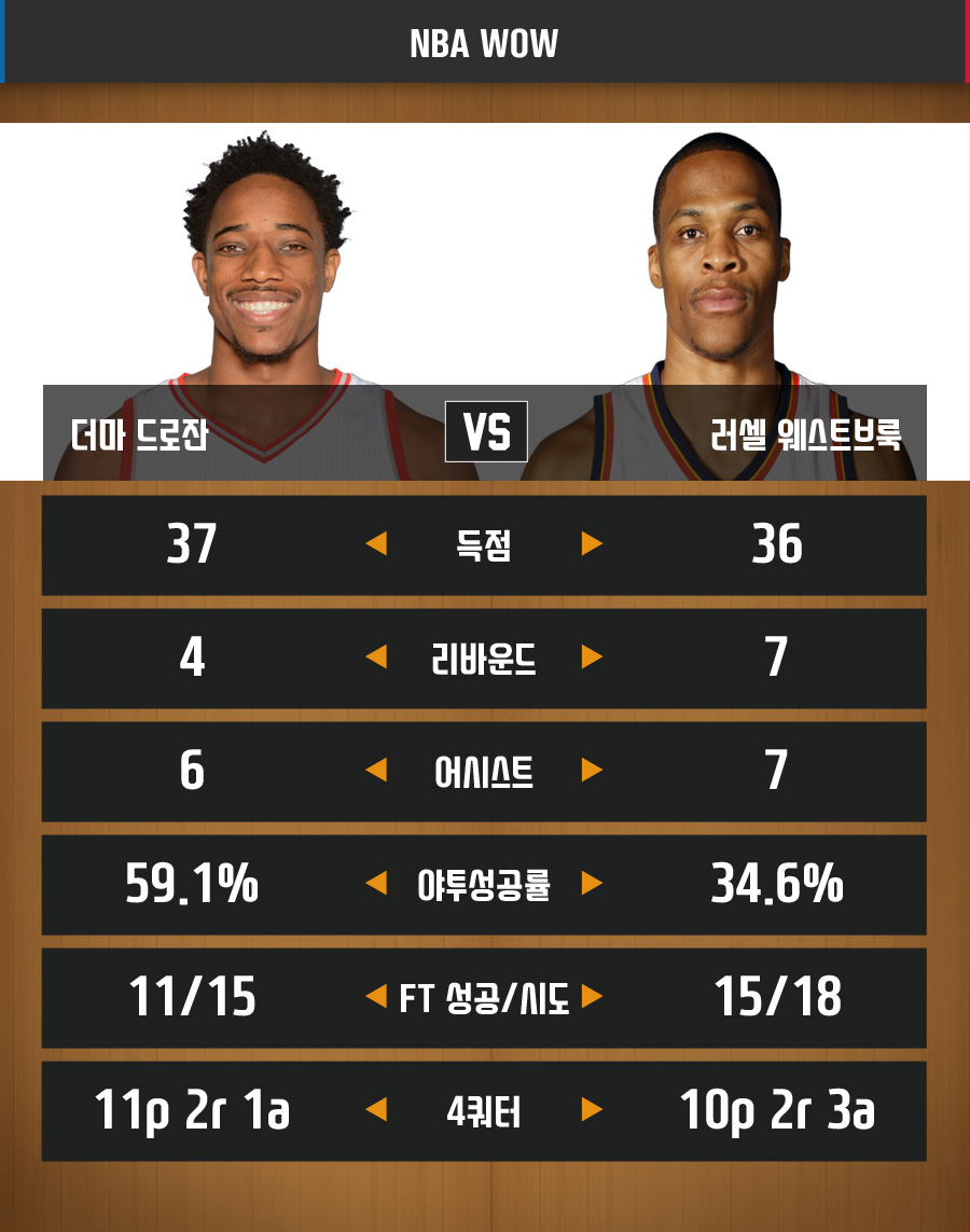이날 경기는 리그 평균 득점 1위 더마 드로잔(34.1점)과 2위 러셀 웨스트브룩(31.1점)의 대결로 많은 관심을 모았다. 과연 최후의 승자는 누구였을까.