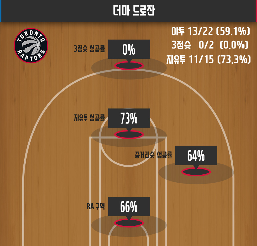 두 선수 모두 무수한 자유투를 얻어낸 것이 눈에 띈다. 웨스트브룩은 리그에서 세 번째로 많은 자유투(11.1개)를 얻는 선수다. 드로잔은 평균 10.0개의 자유투를 따내며 4위에 올라 있다.