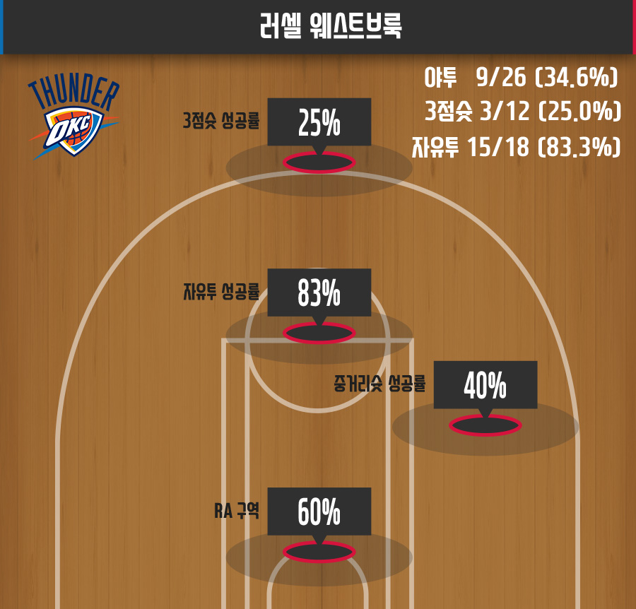 웨스트브룩은 지나치게 3점슛에 의존한 것이 아쉬웠다. 돌파와 자유투로 큰 재미를 봤음에도, 들어가지도 않는 3점슛을 고집하곤 했다. 바로 이 대목에서 두 선수의 효율성 차이가 났다.