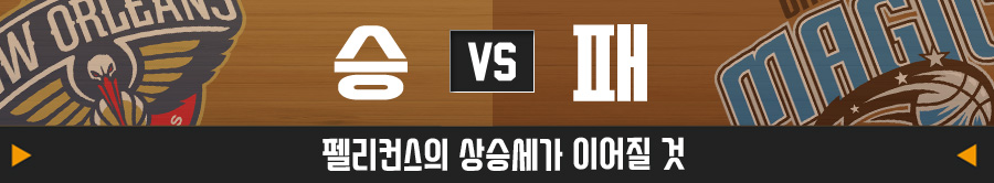 뉴올리언스 펠리컨스는 최근 세 경기에서 두 차례 승리를 거두는 등 나름대로(?) 상승세를 타고 있다. 희소식도 있다. 그간 아내의 병간호로 인해 자리를 비웠던 즈루 할러데이가 복귀할 예정이라는 것. 경기감각을 장담할 수는 없지만 앤써니 데이비스 위주의 뻔한 농구를 했던 펠리컨스에게 큰 도움이 될 전망. 반면 올랜도는 최근 다섯 경기에서 네 경기를 패하는 등 분위기가 좋지 않다.
