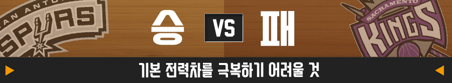 샌안토니오 스퍼스가 새크라멘토 원정에 나선다. 스퍼스는 원정경기에 강한 면모를 보이고 있다. 실제로 이번 시즌 다섯 차례의 원정경기에서 모두 승리를 거뒀다. 단, 부상 변수는 있다. 파우 가솔(목)과 대니 그린(사타구니), 드웨인 데드먼(무릎)이 모두 결장할 것으로 보인다. 그러나 카와이 레너드와 라마커스 알드리지가 건재하기에, 여전히 승리할 것으로 보인다. 토니 파커의 복귀 이후 스퍼스의 경기력이 안정됐다.